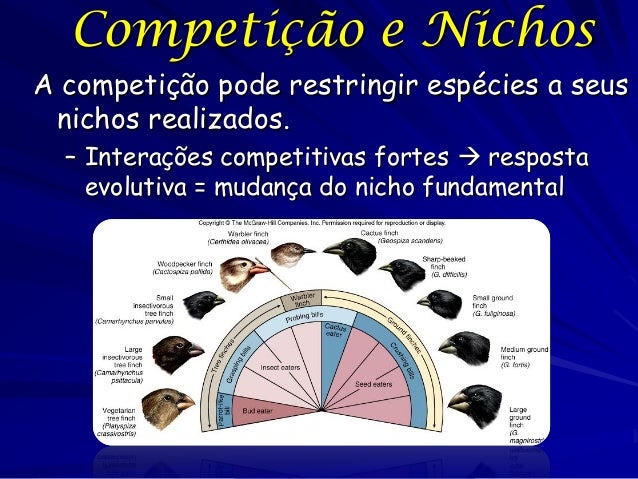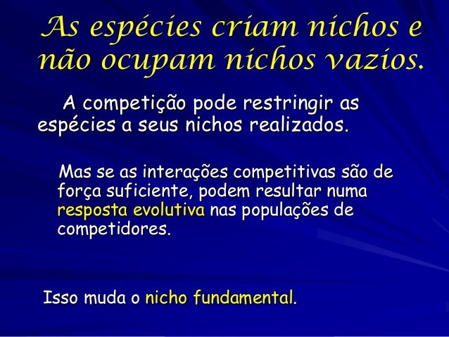 11. 11. As espécies criam nichos enão ocupam nichos vazios. A competição pode restringir asespécies a seus nichos realizados. Mas se as interações competitivas são de força suficiente, podem resultar numa resposta evolutiva nas populações de competidores.Isso muda o nicho fundamental.