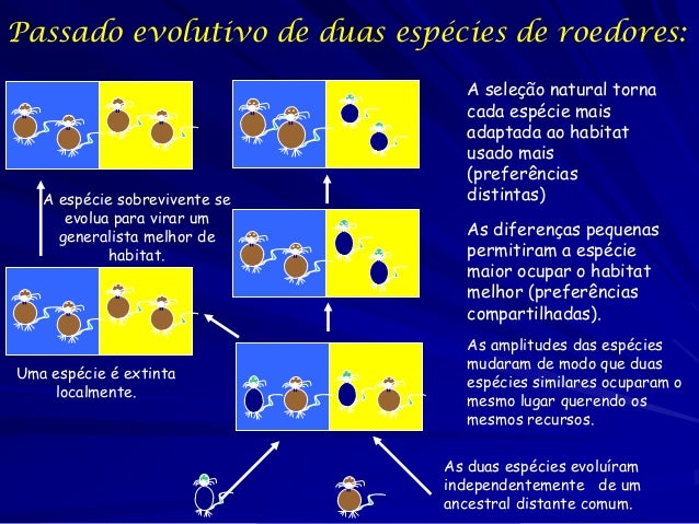 12. 12. Passado evolutivo de duas espécies de roedores: .. .. .. A seleção natural torna.. .. .. .. cada espécie mais .. adaptada ao habitat usado mais (preferências A espécie sobrevivente se distintas) evolua para virar um .. generalista melhor de .. As diferenças pequenas .. habitat. .. permitiram a espécie maior ocupar o habitat .... .. .. melhor (preferências compartilhadas). As amplitudes das espécies mudaram de modo que duasUma espécie é extinta .. .. .. .. espécies similares ocuparam o localmente. mesmo lugar querendo os mesmos recursos. .. As duas espécies evoluíram .. independentemente de um ancestral distante comum.