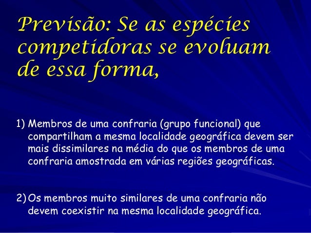13. 13. Previsão: Se as espéciescompetidoras se evoluamde essa forma,1) Membros de uma confraria (grupo funcional) que compartilham a mesma localidade geográfica devem ser mais dissimilares na média do que os membros de uma confraria amostrada em várias regiões geográficas.2) Os membros muito similares de uma confraria não devem coexistir na mesma localidade geográfica.