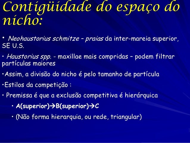 16. 16. Contigüidade do espaço donicho:• Neohaustorius schmitze – praias da inter-mareia superior,SE U.S.• Haustorius spp. - maxillae mais compridas – podem filtrarpartículas maiores•Assim, a divisão do nicho é pelo tamanho de partícula•Estilos da competição :• Premissa é que a exclusão competitiva é hierárquica • A(superior)B(superior)C • (Não forma hierarquia, ou rede, triangular)