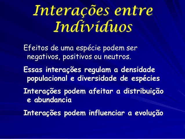 2. 2. Interações entre IndivíduosEfeitos de uma espécie podem ser negativos, positivos ou neutros.Essas interações regulam a densidade populacional e diversidade de espéciesInterações podem afeitar a distribuição e abundanciaInterações podem influenciar a evolução
