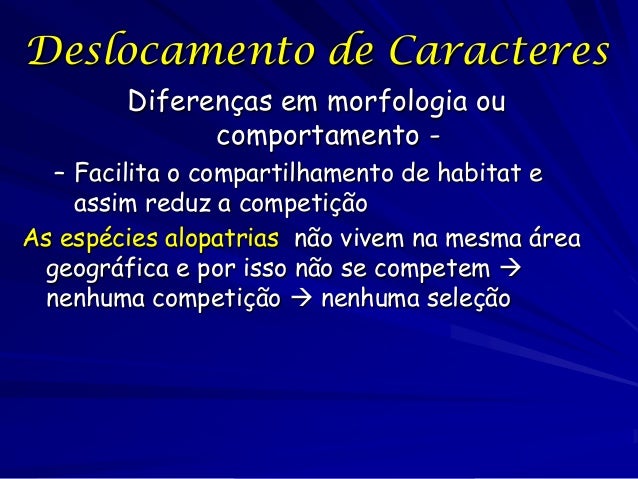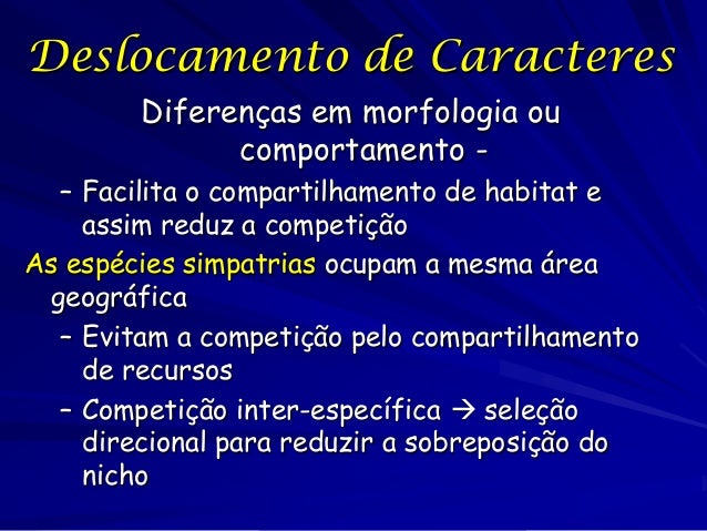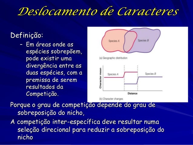 20. 20. Deslocamento de CaracteresDefinição: – Em áreas onde as espécies sobrepõem, pode existir uma divergência entre as duas espécies, com a premissa de serem resultados da Competição.Porque o grau de competição depende do grau de sobreposição do nicho,A competição inter-específica deve resultar numa seleção direcional para reduzir a sobreposição do nicho