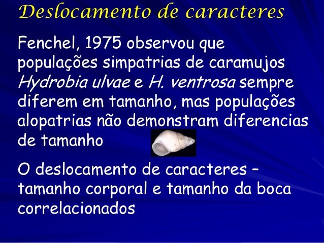23. 23. Deslocamento de caracteresFenchel, 1975 observou quepopulações simpatrias de caramujosHydrobia ulvae e H. ventrosa semprediferem em tamanho, mas populaçõesalopatrias não demonstram diferenciasde tamanhoO deslocamento de caracteres –tamanho corporal e tamanho da bocacorrelacionados