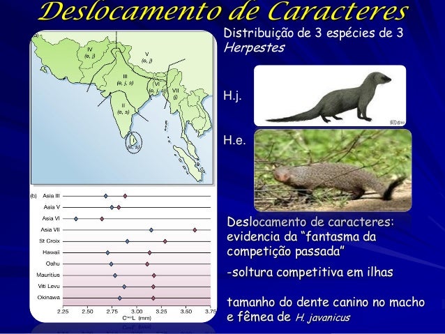 24. 24. Deslocamento de Caracteres Distribuição de 3 espécies de 3 Herpestes H.j. H.e. Deslocamento de caracteres: evidencia da “fantasma da competição passada” -soltura competitiva em ilhas tamanho do dente canino no macho e fêmea de H. javanicus