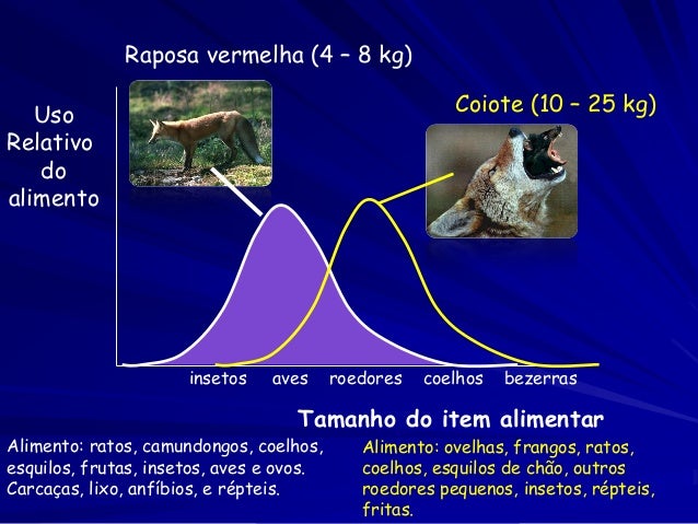 25. 25. Raposa vermelha (4 – 8 kg) Uso Coiote (10 – 25 kg)Relativo doalimento insetos aves roedores coelhos bezerras Tamanho do item alimentarAlimento: ratos, camundongos, coelhos, Alimento: ovelhas, frangos, ratos,esquilos, frutas, insetos, aves e ovos. coelhos, esquilos de chão, outrosCarcaças, lixo, anfíbios, e répteis. roedores pequenos, insetos, répteis, fritas.