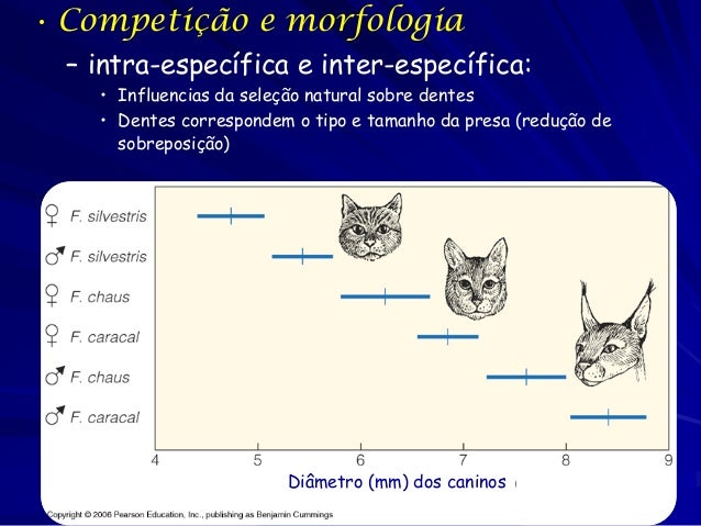 26. 26. • Competição e morfologia – intra-específica e inter-específica: • Influencias da seleção natural sobre dentes • Dentes correspondem o tipo e tamanho da presa (redução de sobreposição) Diâmetro (mm) dos caninos
