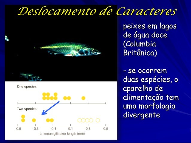 28. 28. Deslocamento de Caracteres peixes em lagos de água doce (Columbia Britânica) - se ocorrem duas espécies, o aparelho de alimentação tem uma morfologia divergente
