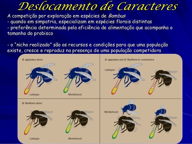 29. 29. Deslocamento de CaracteresA competição por exploração em espécies de Bombus:- quando em simpatria, especializam em espécies florais distintas- preferência determinada pela eficiência de alimentação que acompanha otamanho do probisco- o “nicho realizado” são os recursos e condições para que uma populaçãoexiste, cresce e reproduz na presença de uma população competidora