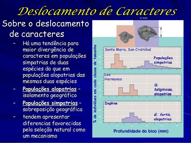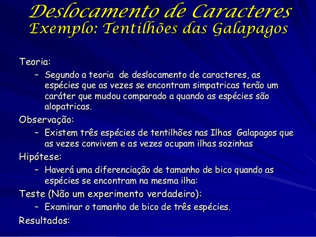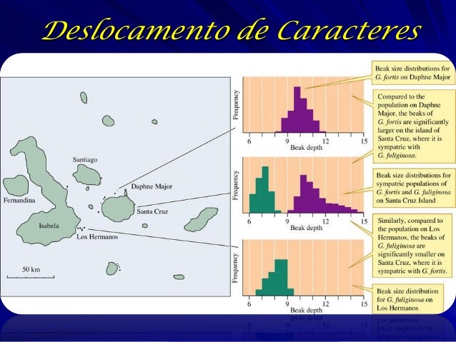 33. 33. Deslocamento de Caracteres Exemplo: Tentilhões das GalapagosTeoria: – Segundo a teoria de deslocamento de caracteres, as espécies que as vezes se encontram simpatricas terão um caráter que mudou comparado a quando as espécies são alopatricas.Observação: – Existem três espécies de tentilhões nas Ilhas Galapagos que as vezes convivem e as vezes ocupam ilhas sozinhasHipótese: – Haverá uma diferenciação de tamanho de bico quando as espécies se encontram na mesma ilha:Teste (Não um experimento verdadeiro): – Examinar o tamanho de bico de três espécies.Resultados: