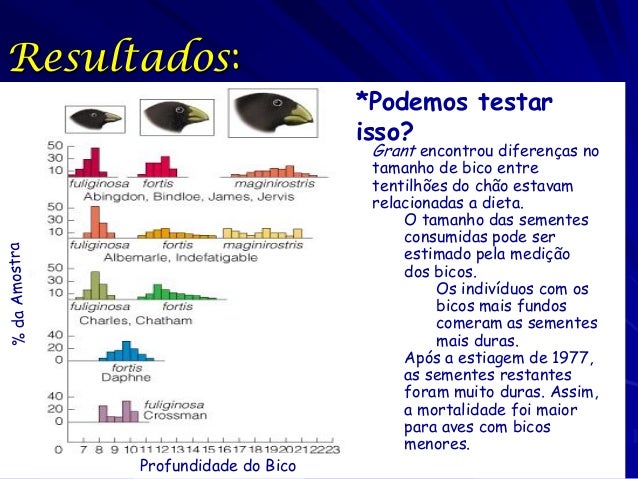 34. 34. Resultados: *Podemos testar isso? Grant encontrou diferenças no tamanho de bico entre tentilhões do chão estavam relacionadas a dieta. O tamanho das sementes consumidas pode ser estimado pela medição dos bicos. Os indivíduos com os bicos mais fundos comeram as sementes mais duras. Após a estiagem de 1977, as sementes restantes foram muito duras. Assim, a mortalidade foi maior para aves com bicos menores. Profundidade do Bico