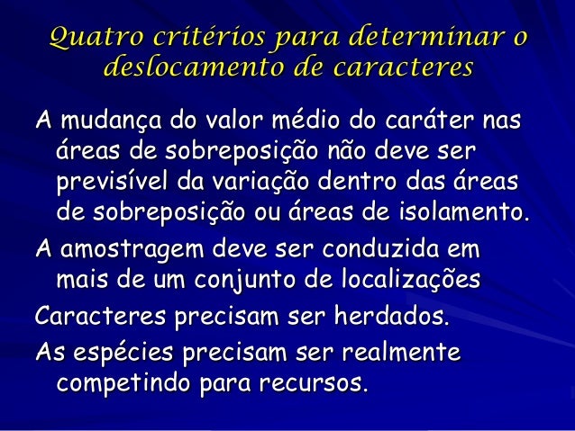 37. 37. Quatro critérios para determinar o deslocamento de caracteresA mudança do valor médio do caráter nas áreas de sobreposição não deve ser previsível da variação dentro das áreas de sobreposição ou áreas de isolamento.A amostragem deve ser conduzida em mais de um conjunto de localizaçõesCaracteres precisam ser herdados.As espécies precisam ser realmente competindo para recursos.