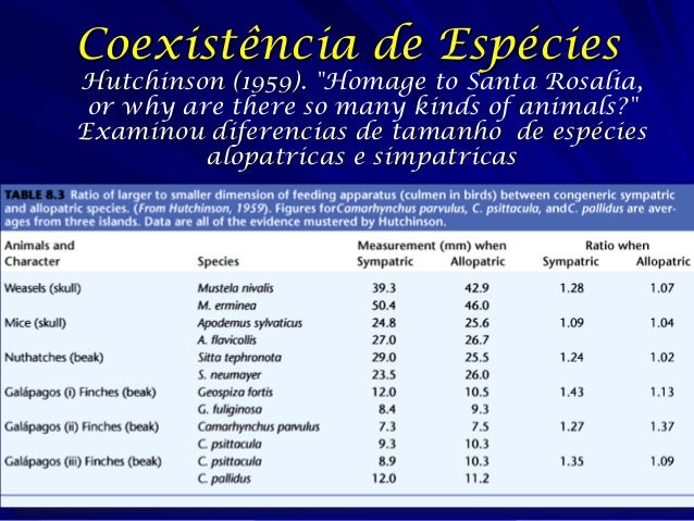 38. 38. Coexistência de EspéciesHutchinson (1959). "Homage to Santa Rosalia, or why are there so many kinds of animals?"Examinou diferencias de tamanho de espécies alopatricas e simpatricas