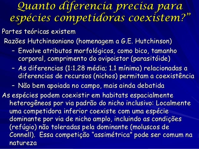 39. 39. Quanto diferencia precisa para espécies competidoras coexistem?”Partes teóricas existem Razões Hutchinsoniano (homenagem a G.E. Hutchinson) – Envolve atributos morfológicos, como bico, tamanho corporal, comprimento do ovipoistor (parasitóide) – As diferencias (1:1.28 média; 1.1 mínima) relacionadas a diferencias de recursos (nichos) permitam a coexistência – Não bem apoiada no campo, mais ainda debatidaAs espécies podem coexistir em habitats espacialmente heterogêneos por via padrão do nicho inclusivo: Localmente uma competidora inferior coexiste com uma espécie dominante por via de nicho amplo, incluindo as condições (refúgio) não toleradas pela dominante (moluscos de Connell). Essa competição “assimétrica” pode ser comum na natureza