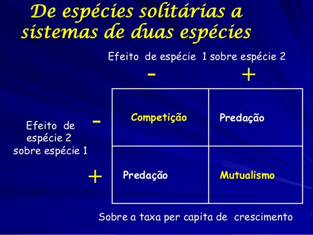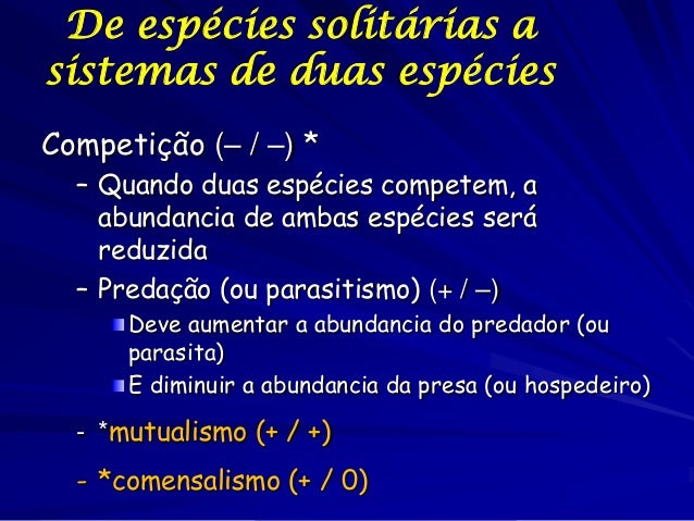 5. 5. De espécies solitárias asistemas de duas espéciesCompetição (– / –) * – Quando duas espécies competem, a abundancia de ambas espécies será reduzida – Predação (ou parasitismo) (+ / –) Deve aumentar a abundancia do predador (ou parasita) E diminuir a abundancia da presa (ou hospedeiro) - *mutualismo (+ / +) - *comensalismo (+ / 0)