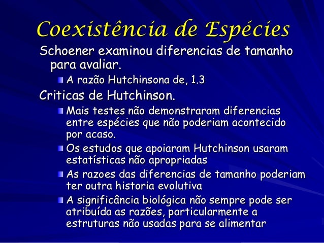 41. 41. Coexistência de EspéciesSchoener examinou diferencias de tamanho para avaliar. A razão Hutchinsona de, 1.3Criticas de Hutchinson. Mais testes não demonstraram diferencias entre espécies que não poderiam acontecido por acaso. Os estudos que apoiaram Hutchinson usaram estatísticas não apropriadas As razoes das diferencias de tamanho poderiam ter outra historia evolutiva A significância biológica não sempre pode ser atribuída as razões, particularmente a estruturas não usadas para se alimentar