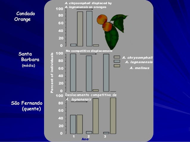 43. 43. A. chrysomphali displaced by A. lagnanensis on oranges 100 Condado 80 Orange 60 40 20 0 No competitive displacement Santa 100 Percent of individuals A. chrysomphali Barbara 80 A. lagnanensis (média) 60 A. melinus 40 20 0 100 Deslocamento competitivo de A. lagnanensisSão Fernando 80 (quente) 60 40 20 0 1 2 3 Ano