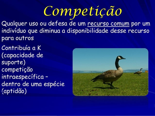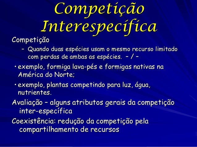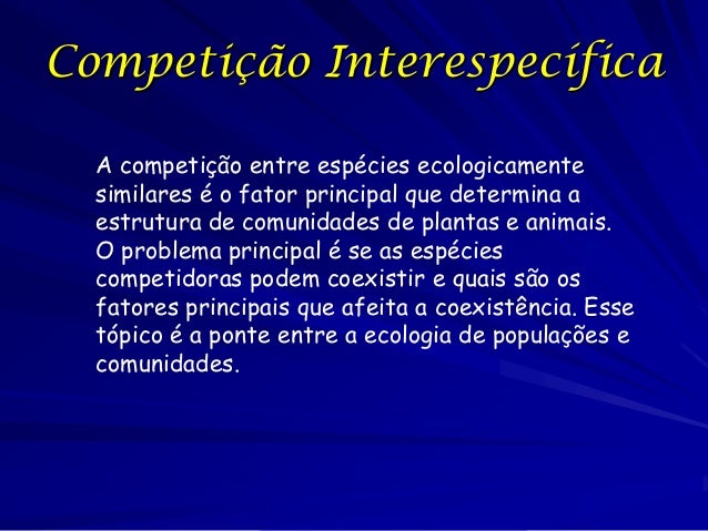 54. 54. Competição Interespecífica A competição entre espécies ecologicamente similares é o fator principal que determina a estrutura de comunidades de plantas e animais. O problema principal é se as espécies competidoras podem coexistir e quais são os fatores principais que afeita a coexistência. Esse tópico é a ponte entre a ecologia de populações e comunidades.