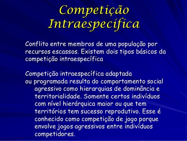 46. 46. Competição IntraespecíficaConflito entre membros de uma população porrecursos escassos. Existem dois tipos básicos dacompetição intraespecíficaCompetição intraespecífica adaptadaou programada resulta do comportamento social agressivo como hierarquias de dominância e territorialidade. Somente certos indivíduos com nível hierárquica maior ou que tem territórios tem sucesso reprodutivo. Esse é conhecido como competição de jogo porque envolve jogos agressivos entre indivíduos competidores.