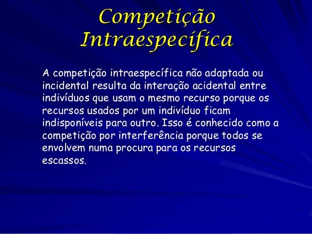 47. 47. Competição IntraespecíficaA competição intraespecífica não adaptada ouincidental resulta da interação acidental entreindivíduos que usam o mesmo recurso porque osrecursos usados por um indivíduo ficamindisponíveis para outro. Isso é conhecido como acompetição por interferência porque todos seenvolvem numa procura para os recursosescassos.