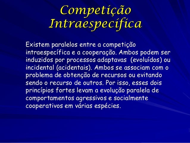 48. 48. Competição IntraespecíficaExistem paralelos entre a competiçãointraespecífica e a cooperação. Ambos podem serinduzidos por processos adaptavas (evoluídos) ouincidental (acidentais). Ambos se associam com oproblema de obtenção de recursos ou evitandosendo o recurso de outros. Por isso, esses doisprincípios fortes levam a evolução paralela decomportamentos agressivos e socialmentecooperativos em várias espécies.