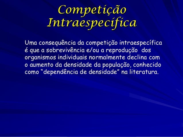 49. 49. Competição IntraespecíficaUma consequência da competição intraespecíficaé que a sobrevivência e/ou a reprodução dosorganismos individuais normalmente declina como aumento da densidade da população, conhecidocomo “dependência de densidade” na literatura.