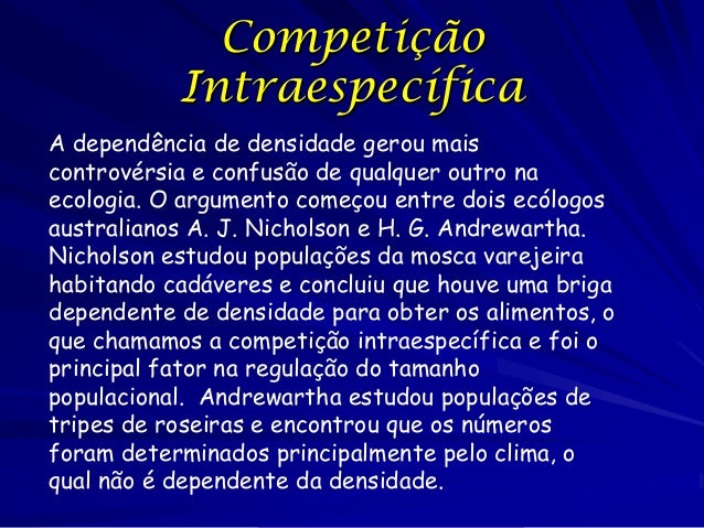 50. 50. Competição IntraespecíficaA dependência de densidade gerou maiscontrovérsia e confusão de qualquer outro naecologia. O argumento começou entre dois ecólogosaustralianos A. J. Nicholson e H. G. Andrewartha.Nicholson estudou populações da mosca varejeirahabitando cadáveres e concluiu que houve uma brigadependente de densidade para obter os alimentos, oque chamamos a competição intraespecífica e foi oprincipal fator na regulação do tamanhopopulacional. Andrewartha estudou populações detripes de roseiras e encontrou que os númerosforam determinados principalmente pelo clima, oqual não é dependente da densidade.