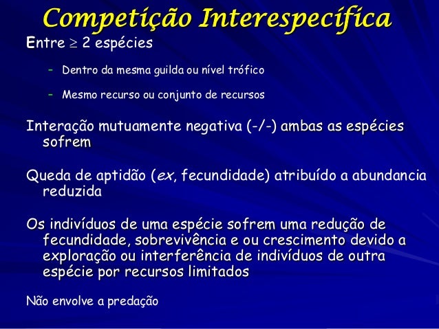 51. 51. Competição InterespecíficaEntre  2 espécies – Dentro da mesma guilda ou nível trófico – Mesmo recurso ou conjunto de recursosInteração mutuamente negativa (-/-) ambas as espécies sofremQueda de aptidão (ex, fecundidade) atribuído a abundancia reduzidaOs indivíduos de uma espécie sofrem uma redução de fecundidade, sobrevivência e ou crescimento devido a exploração ou interferência de indivíduos de outra espécie por recursos limitadosNão envolve a predação