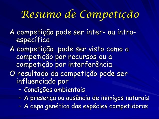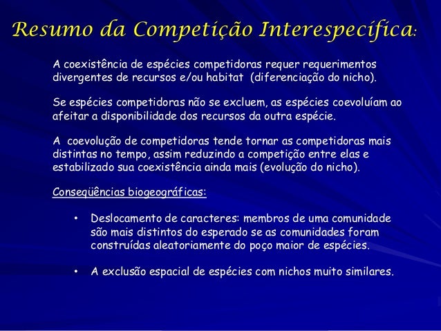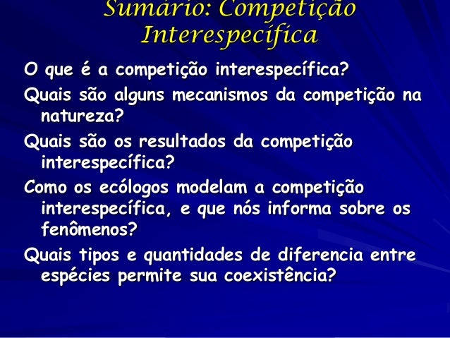 53. 53. Sumário: Competição InterespecíficaO que é a competição interespecífica?Quais são alguns mecanismos da competição na natureza?Quais são os resultados da competição interespecífica?Como os ecólogos modelam a competição interespecífica, e que nós informa sobre os fenômenos?Quais tipos e quantidades de diferencia entre espécies permite sua coexistência?