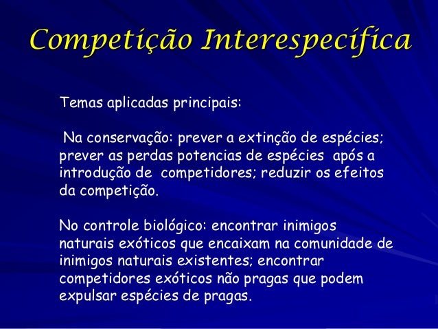 55. 55. Competição Interespecífica Temas aplicadas principais: Na conservação: prever a extinção de espécies; prever as perdas potencias de espécies após a introdução de competidores; reduzir os efeitos da competição. No controle biológico: encontrar inimigos naturais exóticos que encaixam na comunidade de inimigos naturais existentes; encontrar competidores exóticos não pragas que podem expulsar espécies de pragas.
