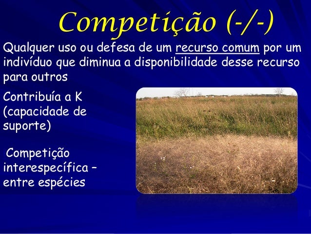 6. 6. Competição (-/-)Qualquer uso ou defesa de um recurso comum por umindivíduo que diminua a disponibilidade desse recursopara outrosContribuía a K(capacidade desuporte)iCompetiçãointerespecífica –entre espécies