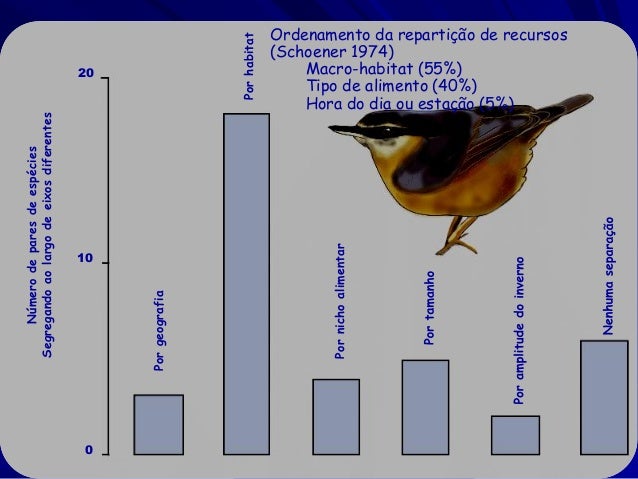 59. 59. Ordenamento da repartição de recursos Por habitat (Schoener 1974) 20 Macro-habitat (55%) Tipo de alimento (40%) Hora do dia ou estação (5%)Segregando ao largo de eixos diferentes Número de pares de espécies Por nicho alimentar 10 Por geografia 0