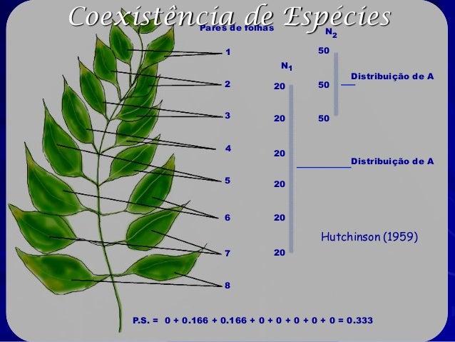 61. 61. Coexistência de Espécies Pares de folhas N2 1 50 N1 Distribuição de A 2 20 50 3 20 50 4 20 Distribuição de A 5 20 6 20 Hutchinson (1959) 7 20 8 P.S. = 0 + 0.166 + 0.166 + 0 + 0 + 0 + 0 + 0 = 0.333