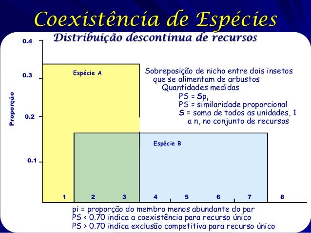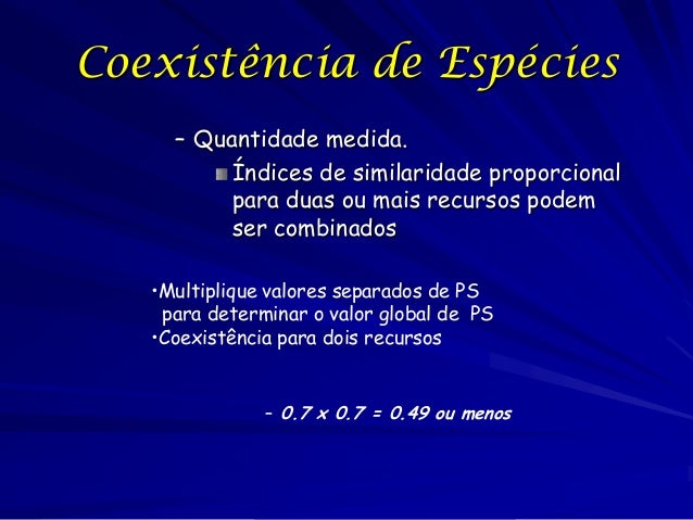 63. 63. Coexistência de Espécies – Quantidade medida. Índices de similaridade proporcional para duas ou mais recursos podem ser combinados •Multiplique valores separados de PS para determinar o valor global de PS •Coexistência para dois recursos – 0.7 x 0.7 = 0.49 ou menos
