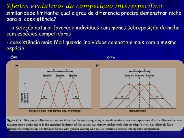 64. 64. Efeitos evolutivos da competição interespecíficasimilaridade limitante: qual o grau de diferencia precisa demonstrar nichopara a coexistência? - a seleção natural favorece indivíduos com menos sobreposição de nichocom espécies competidoras- coexistência mais fácil quando indivíduos competem mais com a mesmaespécie d>w, d<<w