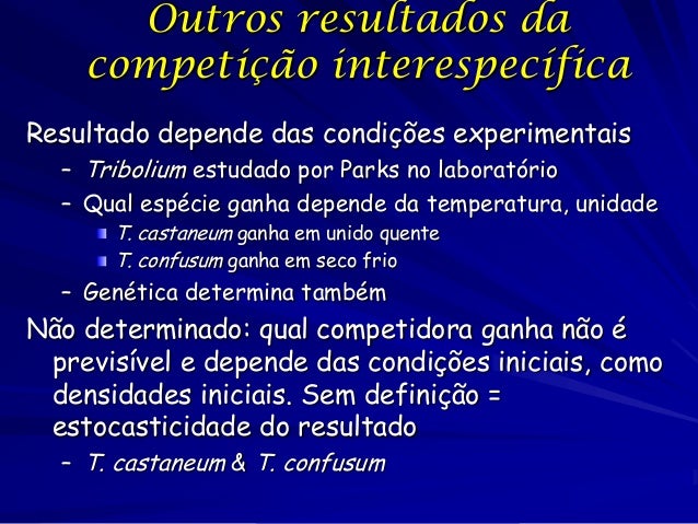 67. 67. Outros resultados da competição interespecíficaResultado depende das condições experimentais – Tribolium estudado por Parks no laboratório – Qual espécie ganha depende da temperatura, unidade T. castaneum ganha em unido quente T. confusum ganha em seco frio – Genética determina tambémNão determinado: qual competidora ganha não é previsível e depende das condições iniciais, como densidades iniciais. Sem definição = estocasticidade do resultado – T. castaneum & T. confusum