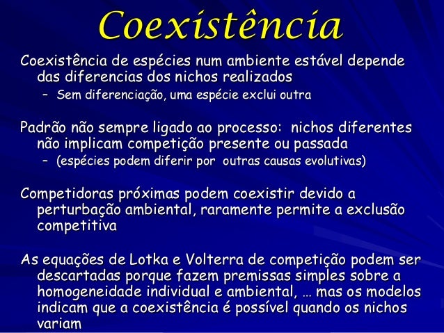 68. 68. CoexistênciaCoexistência de espécies num ambiente estável depende das diferencias dos nichos realizados – Sem diferenciação, uma espécie exclui outraPadrão não sempre ligado ao processo: nichos diferentes não implicam competição presente ou passada – (espécies podem diferir por outras causas evolutivas)Competidoras próximas podem coexistir devido a perturbação ambiental, raramente permite a exclusão competitivaAs equações de Lotka e Volterra de competição podem ser descartadas porque fazem premissas simples sobre a homogeneidade individual e ambiental, … mas os modelos indicam que a coexistência é possível quando os nichos variam
