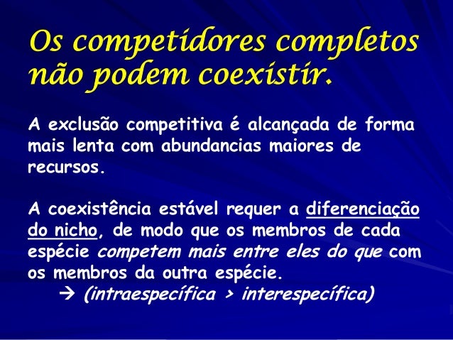 69. 69. Os competidores completosnão podem coexistir.A exclusão competitiva é alcançada de formamais lenta com abundancias maiores derecursos.A coexistência estável requer a diferenciaçãodo nicho, de modo que os membros de cadaespécie competem mais entre eles do que comos membros da outra espécie.  (intraespecífica > interespecífica)