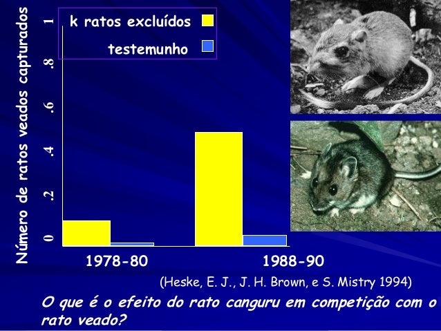 71. 71. Número de ratos veados capturados k ratos excluídos 1 .8 .6 .4 .2 0 testemunho 1978-80 1988-90 (Heske, E. J., J. H. Brown, e S. Mistry 1994) O que é o efeito do rato canguru em competição com o rato veado?
