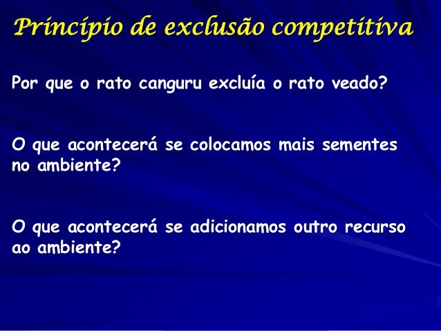 72. 72. Princípio de exclusão competitivaPor que o rato canguru excluía o rato veado?O que acontecerá se colocamos mais sementesno ambiente?O que acontecerá se adicionamos outro recursoao ambiente?