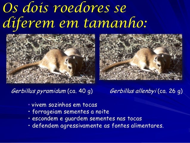 75. 75. Os dois roedores sediferem em tamanho: Gerbillus pyramidum (ca. 40 g) Gerbillus allenbyi (ca. 26 g) • vivem sozinhos em tocas • forrageiam sementes a noite • escondem e guardem sementes nas tocas • defendem agressivamente as fontes alimentares.