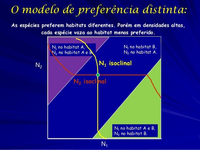 77. 77. O modelo de preferência distinta:As espécies preferem habitats diferentes. Porém em densidades altas, cada espécie vaza ao habitat menos preferido. N1 no habitat A, N1 no habitat B, N2 no habitat A e B. N2 no habitat A. N2 N1 isoclinal N2 isoclinal N1 no habitat A e B, N2 no habitat B. N1