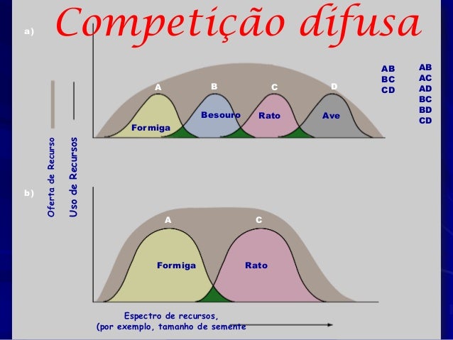 81. 81. a) Competição difusa AB AB BC AC A B C D CD AD BC BD Besouro Rato Ave CD Formiga Oferta de Recurso Uso de Recursosb) A C Formiga Rato Espectro de recursos, (por exemplo, tamanho de semente