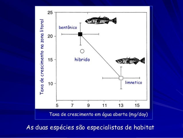 86. 86. Taxa de crescimento na zona litoral bentônico hibrido limnetico Taxa de crescimento em água aberta (mg/day)As duas espécies são especialistas de habitat