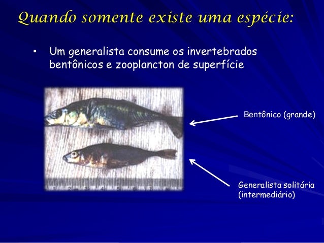 87. 87. Quando somente existe uma espécie: • Um generalista consume os invertebrados bentônicos e zooplancton de superfície Bentônico (grande) Generalista solitária (intermediário)