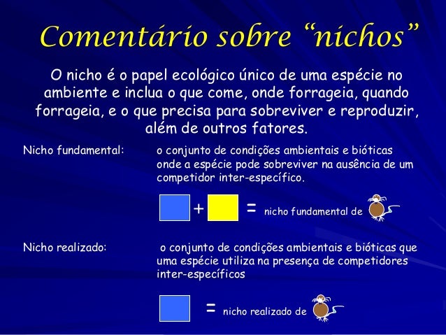 9. 9. Comentário sobre “nichos” O nicho é o papel ecológico único de uma espécie no ambiente e inclua o que come, onde forrageia, quando forrageia, e o que precisa para sobreviver e reproduzir, além de outros fatores.Nicho fundamental: o conjunto de condições ambientais e bióticas onde a espécie pode sobreviver na ausência de um competidor inter-específico. = nicho fundamental de .. +Nicho realizado: o conjunto de condições ambientais e bióticas que uma espécie utiliza na presença de competidores inter-específicos = nicho realizado de ..