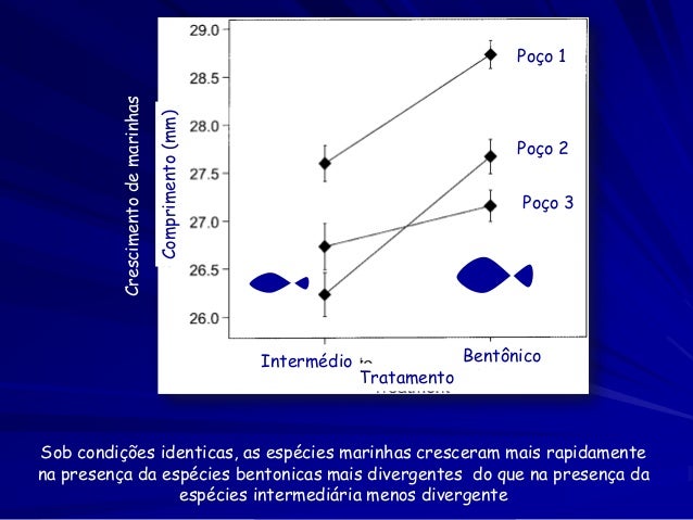 91. 91. Poço 1 Crescimento de marinhas Comprimento (mm) Poço 2 Poço 3 Intermédio Bentônico TratamentoSob condições identicas, as espécies marinhas cresceram mais rapidamentena presença da espécies bentonicas mais divergentes do que na presença da espécies intermediária menos divergente