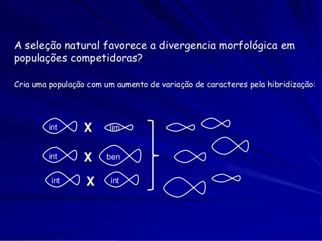 92. 92. A seleção natural favorece a divergencia morfológica empopulações competidoras?Cria uma população com um aumento de variação de caracteres pela hibridização: int X lim int X ben int X int