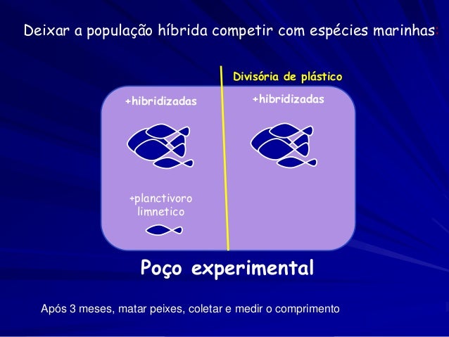 93. 93. Deixar a população híbrida competir com espécies marinhas: Divisória de plástico +hibridizadas +hibridizadas +planctivoro limnetico Poço experimental Após 3 meses, matar peixes, coletar e medir o comprimento