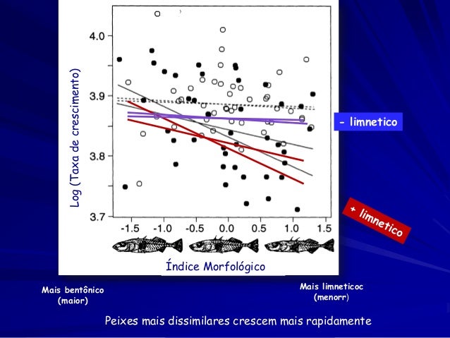 94. 94. Log (Taxa de crescimento) - limnetico Índice MorfológicoMais bentônico Mais limneticoc (maior) (menorr) Peixes mais dissimilares crescem mais rapidamente