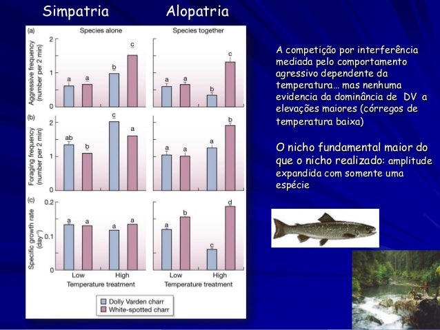 95. 95. Simpatria Alopatria A competição por interferência mediada pelo comportamento agressivo dependente da temperatura… mas nenhuma evidencia da dominância de DV a elevações maiores (córregos de temperatura baixa) O nicho fundamental maior do que o nicho realizado: amplitude expandida com somente uma espécie